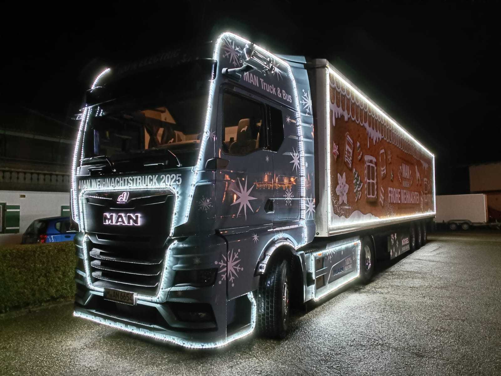 01.12.2025: Am vergangenen Montagabend sorgte der festlich geschmückte MAN-Weihnachtstruck für strahlende Augen bei Kindern, Familien und Mitarbeitern der Kinderkrebshilfe BGL und TS. Der imposante Lastwagen, liebevoll dekoriert mit hunderttausenden Lichtern und weihnachtlichen Motiven, machte im Rahmen seiner diesjährigen Benefiz-Tour Halt auf dem Vereinsgelände und verwandelte es für einige Stunden in eine kleine Weihnachtswelt.