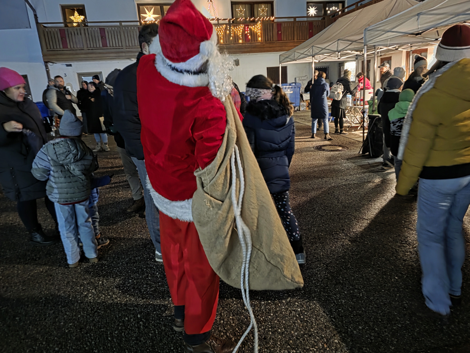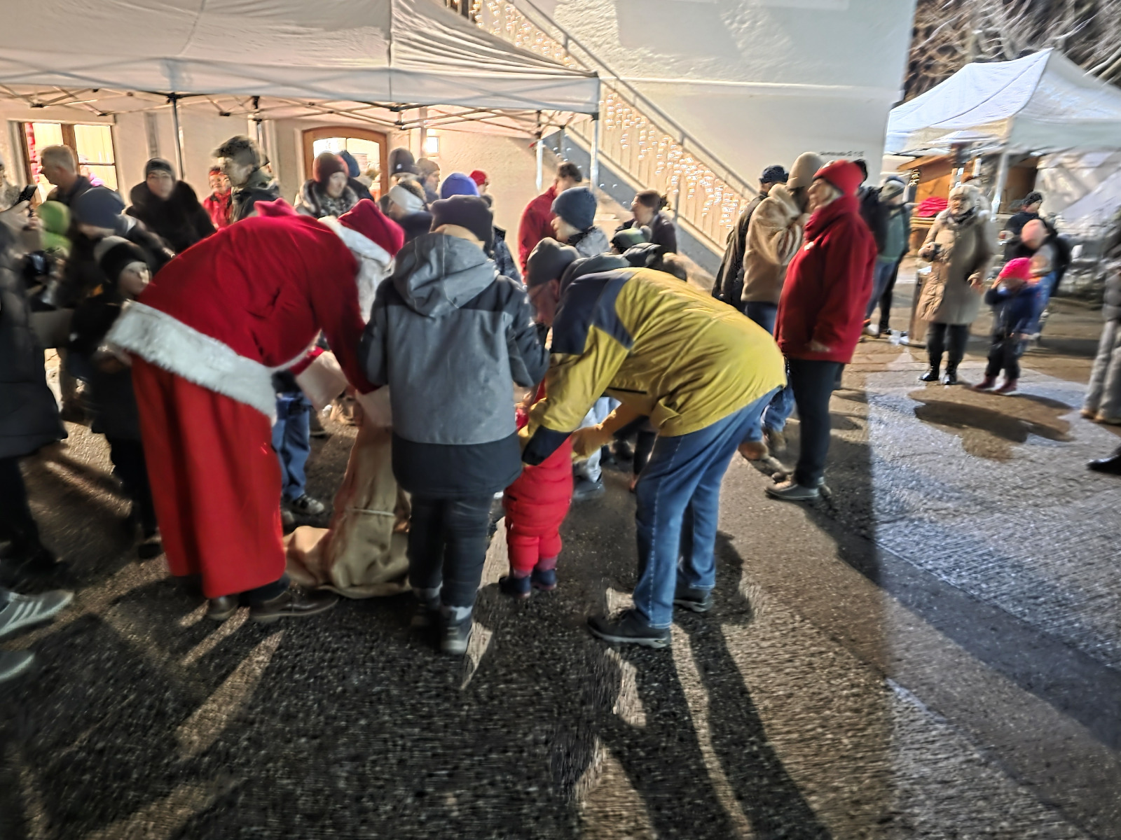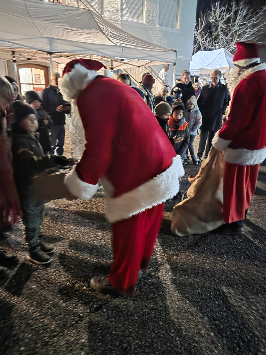 Schon beim Eintreffen des Trucks um 17:30 Uhr versammelten sich die gut 100 Personen der betroffenen Familien und ehrenamtlich Tätigen, um das besondere Ereignis mitzuerleben. Die Fahrer hatten zugegeben etwas Mühe das übergroße Fahrzeug in den Parkplatz zu lenken. Aber viel Geschick machte es dann doch möglich und so wurden die zwei Nikolaus samt Sack und Geschenken recht herzlich von allen Besuchern empfangen. „Ein herzliches Grüß Gott“, sprach auch die Vereinsvorsitzende Rosmarie Baumgartner dem hohen Besuch und auch allen Gästen aus. Der feierliche Abend wurde ganz wunderbar umrahmt von der Oberteisendorfer Bläsergruppe, welche mit stimmungsvollen Weisen diesen besonderen Abend noch einmal mehr zum Leuchten brachte. An Speis und Trank mangelte es ebenso nicht und so wurden Groß und Klein mit sehr guten Hofwirt-Bosnas, Gebäck, Punsch und Glühwein von den emsigen Ehrenamtlichen umsorgt. Die Kinder und auch Erwachsenen waren vom Anblick und dem Ambiente hellauf begeistert und so sorgte der hinterlassene Eindruck bestimmt auch zu späterer Stunde Stoff für die Träume der Kleinen und vielleicht auch Großen Besucher. Ein herzliches Dankeschön sagt die Kinderkrebshilfe BGL + TS.